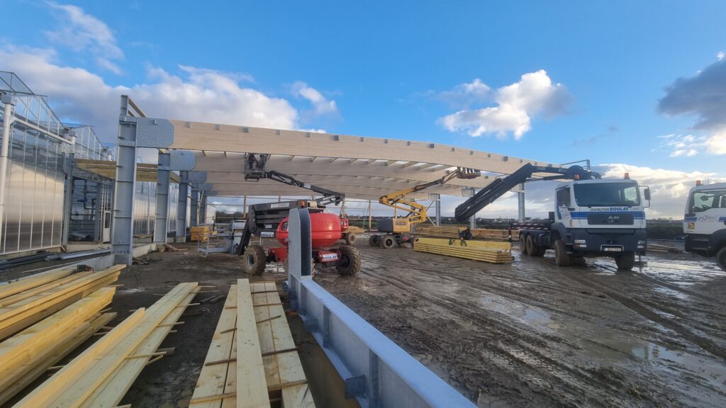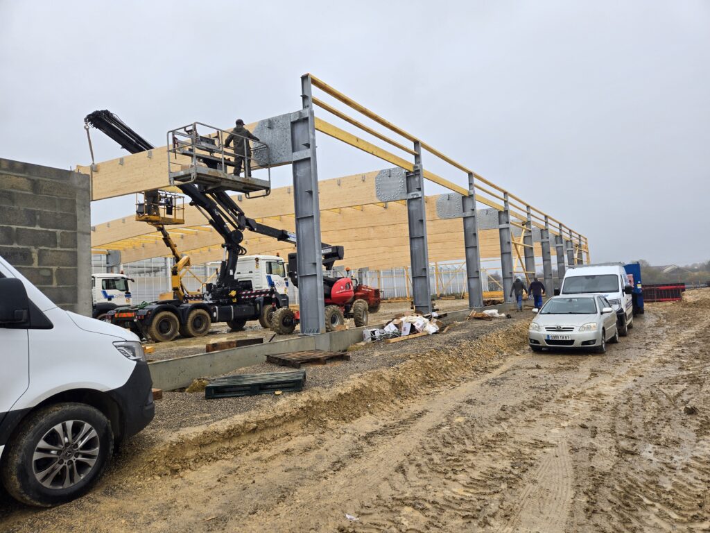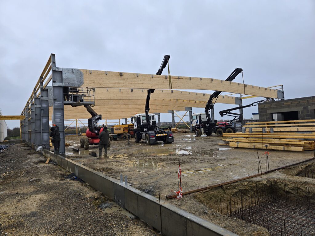 Une fois la maçonnerie terminée, les poutres de la charpente sont arrivées en convoi exceptionnel (30 mètres de longueur), les charpentiers se sont donc attelés au levage impressionnant de la charpente.