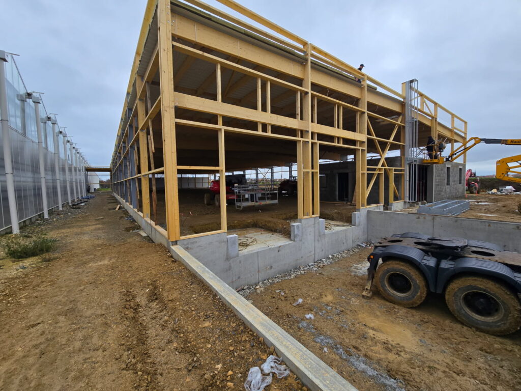 Nos équipes de maçons ont réalisé l'ensemble des fondations et de la structure afin de recevoir la charpente : Massifs de fondations, longrines, dés béton, mur de quai, mur agglos, plancher béton.